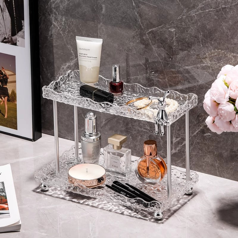 โจ 2-Tier Acrylic Storage Rack โ Elegant crystal-clear design keeps makeup, perfumes, skincare, and accessories neatly organized and beautifully displayed.