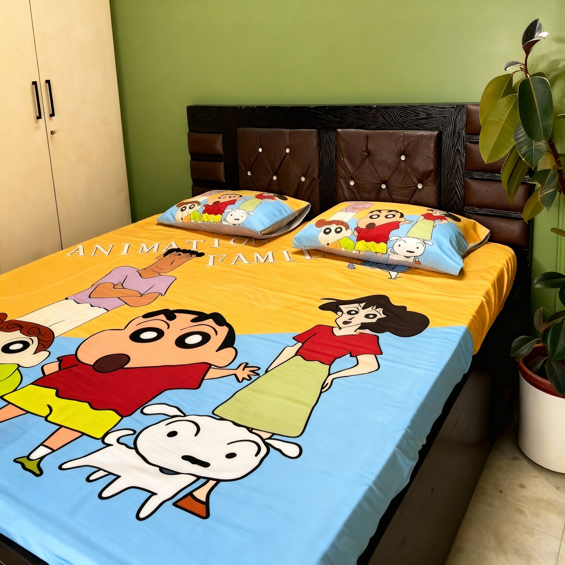 ๐๏ธ Shinchan Family Bedsheet Set ๐งธ | Cute Cartoon Bedding ๐ถ | Soft & Colorful Fabric ๐จ | Includes Pillow Covers ๐ค